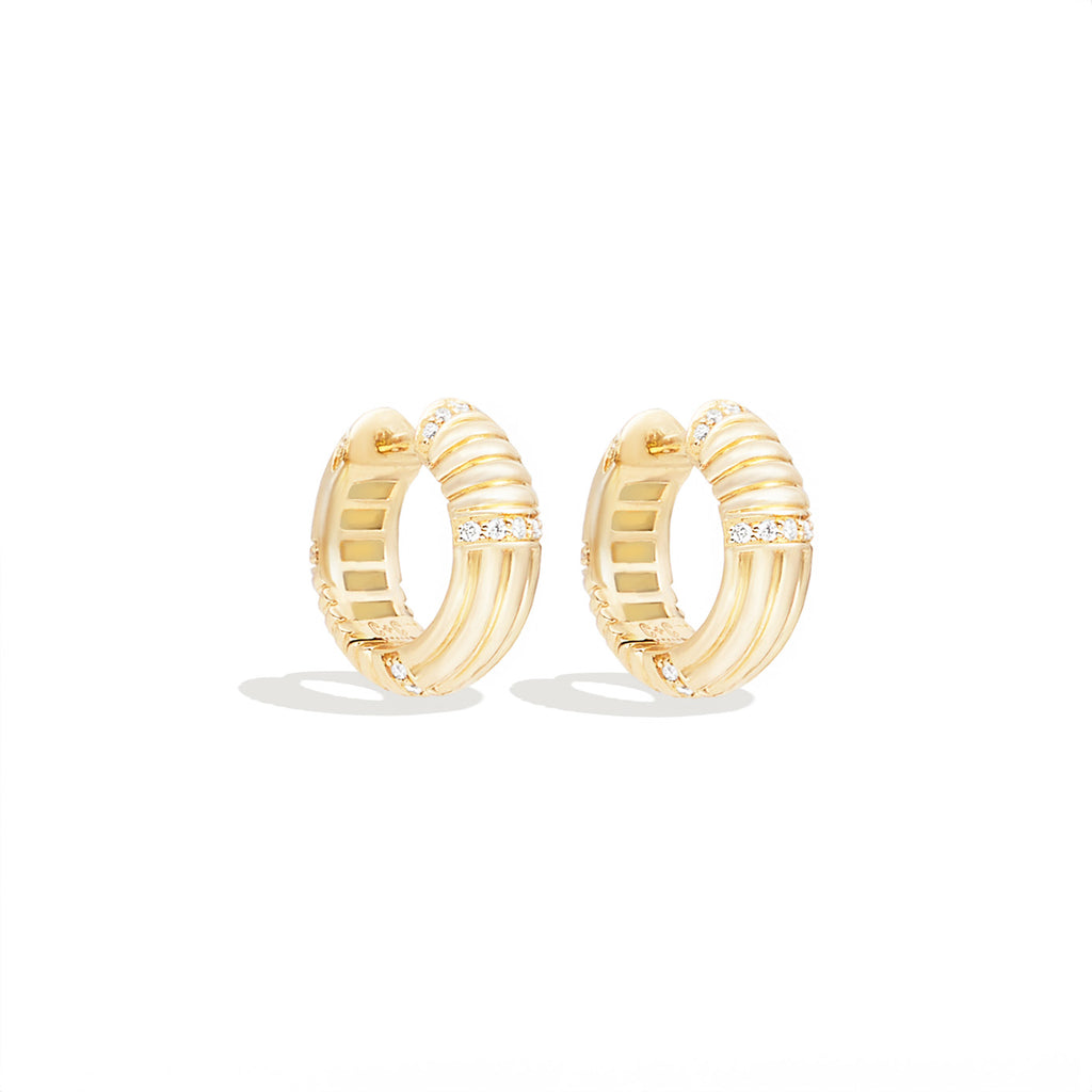 14 Karat Yellow Gold Round Ribbed Huggy Diamond Earrings