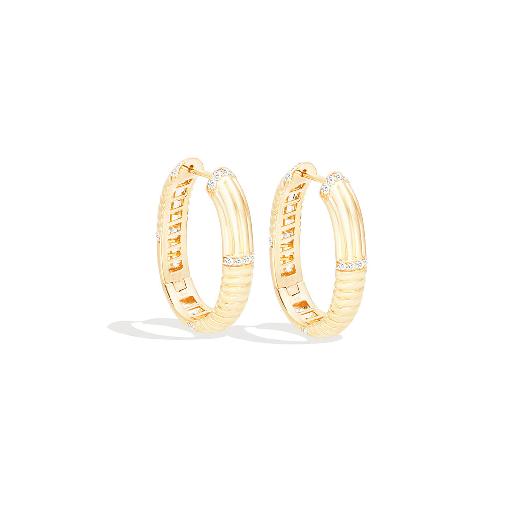 14 Karat Yellow Gold Round Ribbed Oval Hoop Diamond Earrings